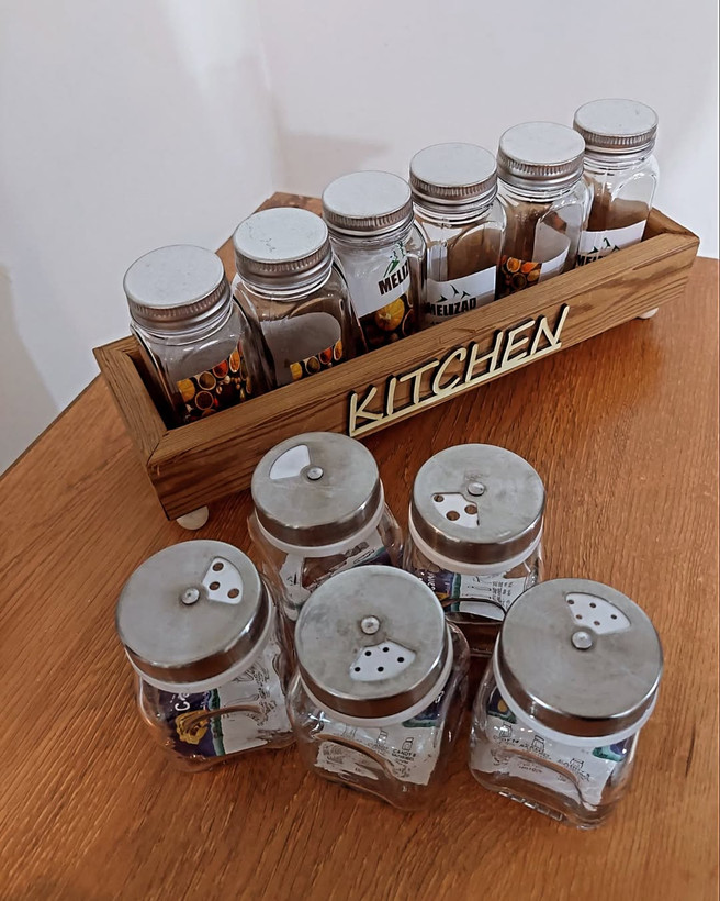 استند مکارتی شامل یک شیشه مکارتی با درب نمکدونی و ۵ شیشه جاادویه با چند مدل درب ادویه پاش است.